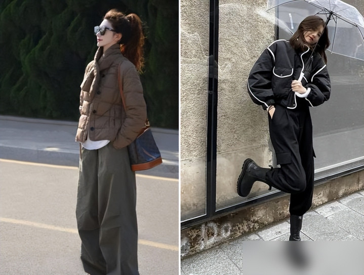 阔腿裤是万能搭子,西装面料或牛仔材质都行,宽松裤腿藏住粗腿,配上短羽绒显高又洒脱。
