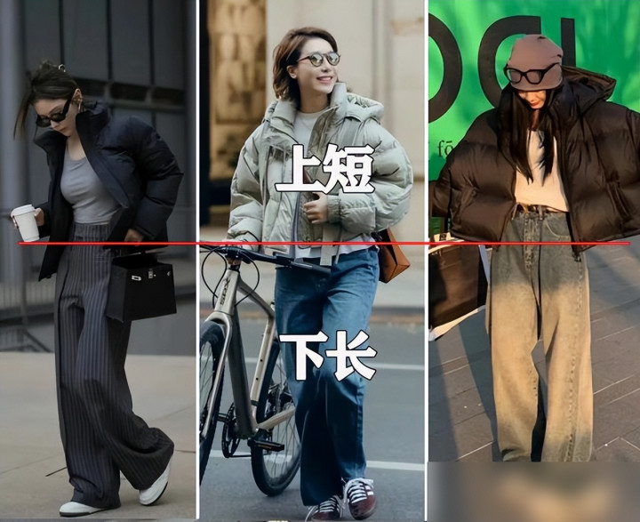 比如“短款配长裤”,身高一米六也能穿出一米七的气场,视觉上像开了长腿特效,保暖还不耽误拍照发朋友圈。
