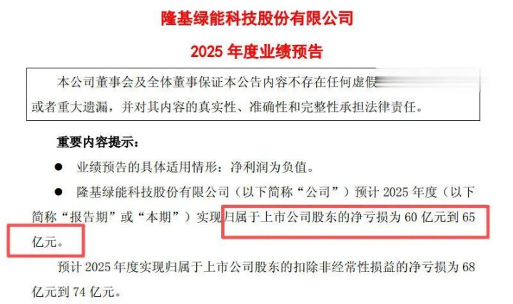 隆基绿能公告称,经财务部门初步测算,预计2025年度实现归属于上市公司股东的净亏损为60亿元到65亿元。预计2025年度实现归属于上市公司股东的扣除非经常性损益的净亏损为68亿元到74亿元。
