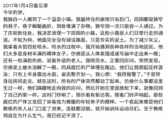 在这段被详细记录的梦中,小岛置身于一个温泉小镇的寄宿公寓。起初,他试图通过洒水清理住所周围狭窄肮脏的小巷,以向新邻居示好。过程中,他遇到了形似素描中走出的“丰满裸体女性”和说外语的伤疤老人。