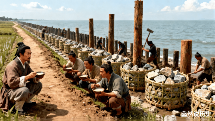 朕琢磨着不能硬堵,就发明了“石囤木桩法”——把大石块装进结实的竹笼里,一排排码在岸边,再打深木桩固定住,比以前堆土坯的海塘结实十倍都不止。