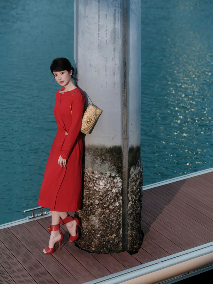写真中,杨紫身着一袭正红色长袖连衣裙,流畅的剪裁贴合身形,勾勒出纤细的腰线与优美的肩颈线条。正红色调浓郁又明艳,衬得她肌肤胜雪,在江畔的冷色调背景中格外抢眼。